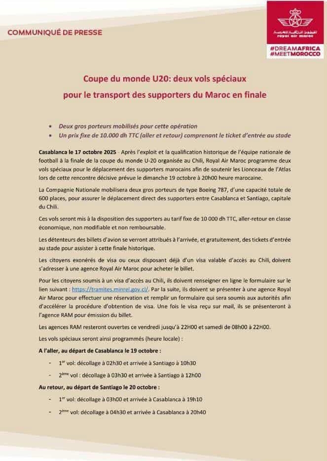 أعلنت الخطوط الملكية المغربية (لارام) عن برمجة رحلتين جويتين خاصتين لنقل الجماهير المغربية إلى كأس العالم لكرة القدم تحت 20 سنة 2025، التي ستُقام مباراتها النهائية يوم الأحد 19 أكتوبر الجاري في العاصمة التشيلية سانتياغو، على الساعة الثامنة مساء بتوقيت المغرب.