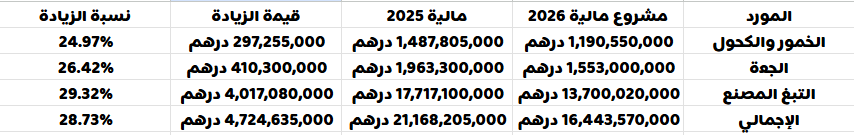 وأوضح مشروع قانون المالية لسنة 2026، أن المداخيل المتوقعة من رسوم الخمور والكحول ستبلغ حوالي 1.488 مليار درهم، فيما يُتوقع أن تصل رسوم الجعة إلى 1.963 مليار درهم، بينما يتوقع أن تصل عائدات التبغ المصنع إلى 17.717 مليار درهم.